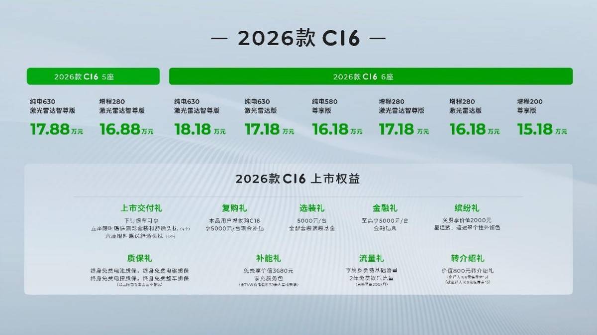 2026款零跑C16 还提供了6座版车型可选,主要针对舒适、智能、续航三大方面进行升级,并且配置升级超过70项,可以说诚意十足。值得一提的是,新车相比部分旧款车型还降低了价格,降价增配的做法获得了一致好评。